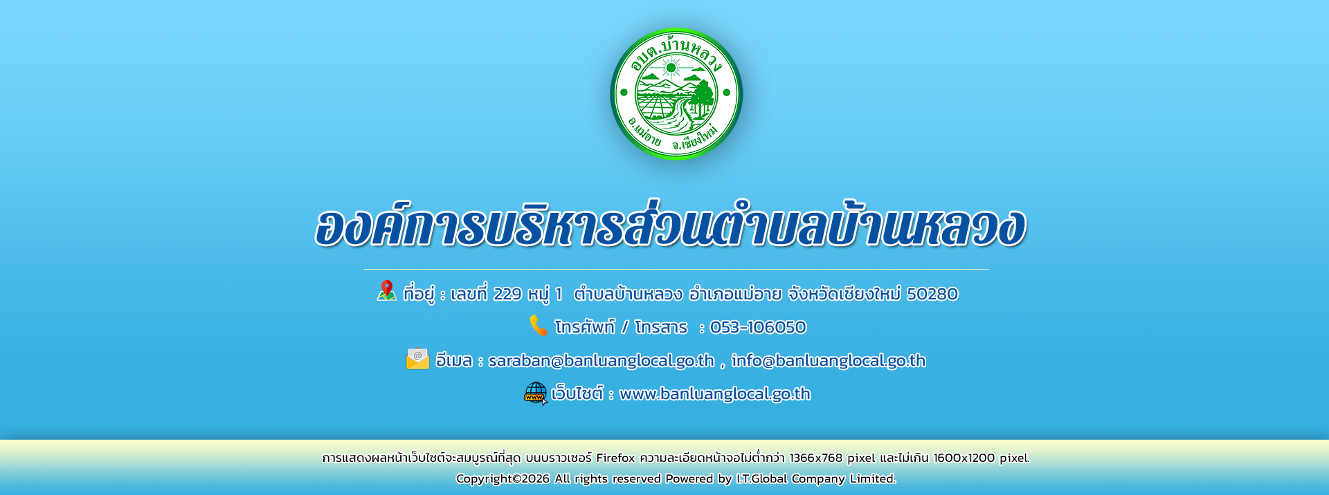 ยินดีต้อนรับเข้าสู่ องค์การบริหารส่วนตำบลบ้านหลวง ติดต่อสอบถาม : โทรศัพท์ / โทรสาร (แฟกซ์) : 053-106050 อีเมล : saraban@banluanglocal.go.th , info@banluanglocal.go.th